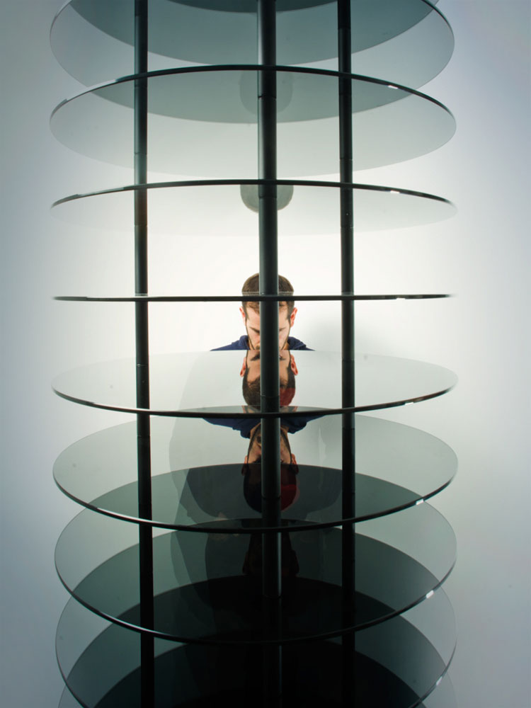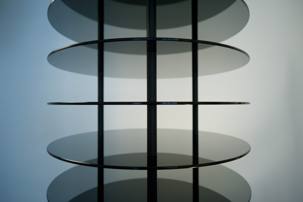 As working with archetypes and typologies is part of our daily reality in the studio, it was natural to take the given freedom and start toying around in this direction. The result is a game of typological contradictions and contrasts. It is a peculiar piece of furniture: a glass tower standing 2,6 meters high, supported by three fragile looking rods, each standing on a slightly oversized wheel.
