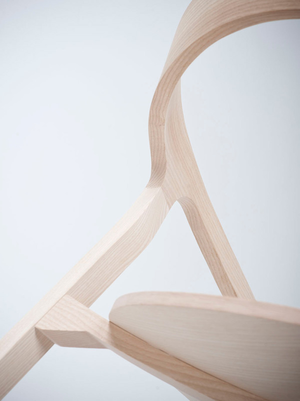 The top half of HE SAID / SHE SAID reveals the sophistication of Mattiazzi’s manufacturing technologies. The smooth geometry that joins the backrest, armrests and legs is the formal language of injection-molded plastic, and it’s surprising to see in wood. I gather that using an 8-axis CNC machine to carve wood is essentially the reverse process of excavating an aluminum mould for a plastic chair. So industrial wood is not an oxymoron. The level of handcraft in the joints that run along these contoured surfaces is also impressive. When it came to the legs and seat you kept the manufacturing simple, using straight stock and bent planes. This mixture of high and low-tech processes gives the collection a strong identity.
