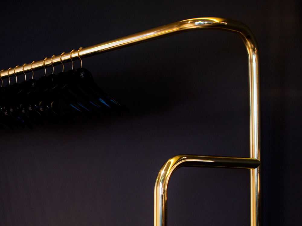 Unlike the original version where the bent steel tube were welded together (with fine structured powder coating) the limitations of working with brass pushed us into further developing the structure to become a flat-packed knock-down object assembled and held together with only two bolts.