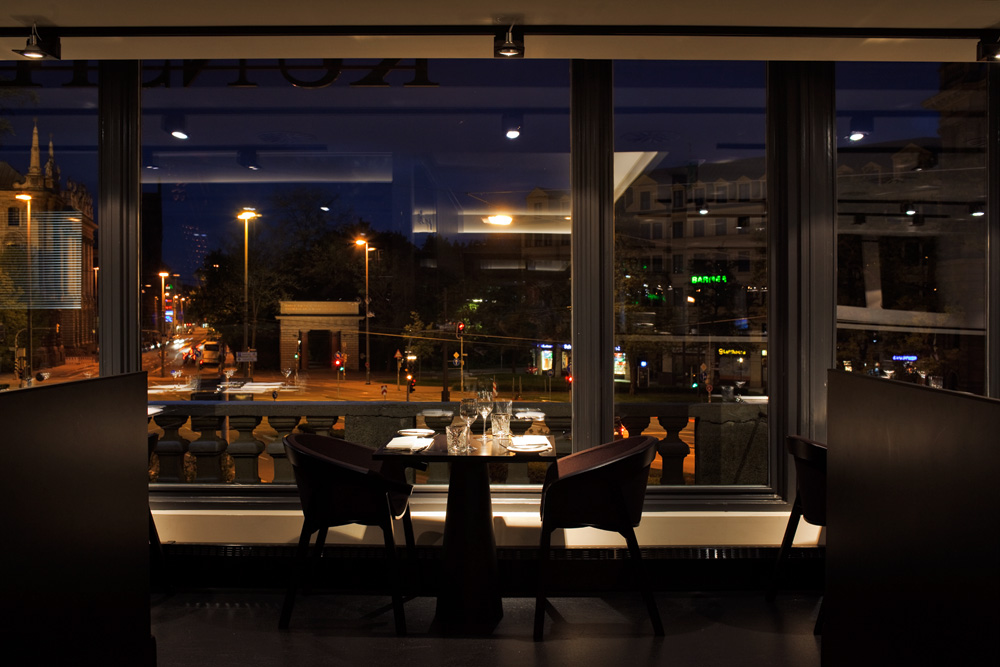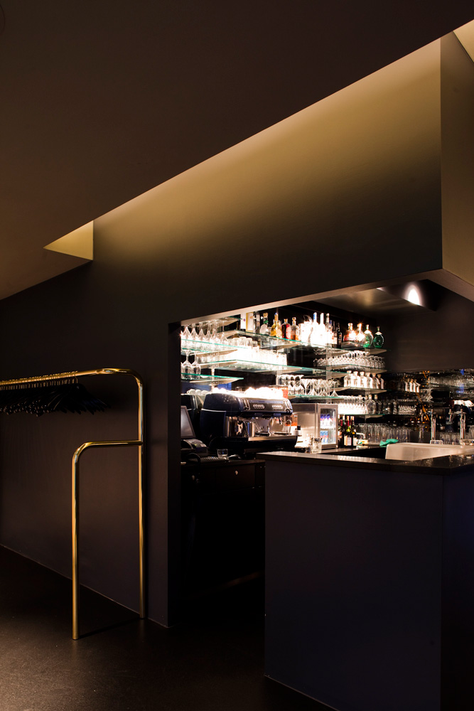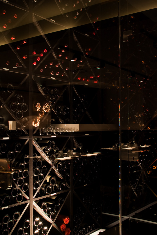 Looking at wine not only as something complementary but at times also as the main course, the owners asked us to integrate an extensive wine room. The result is a transparent walk in wine room with three temperature zones, which connects the bar and the kitchen and forms a center to the otherwise slight convoluted space.