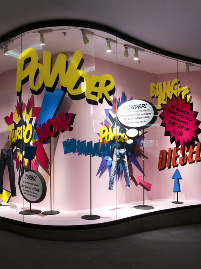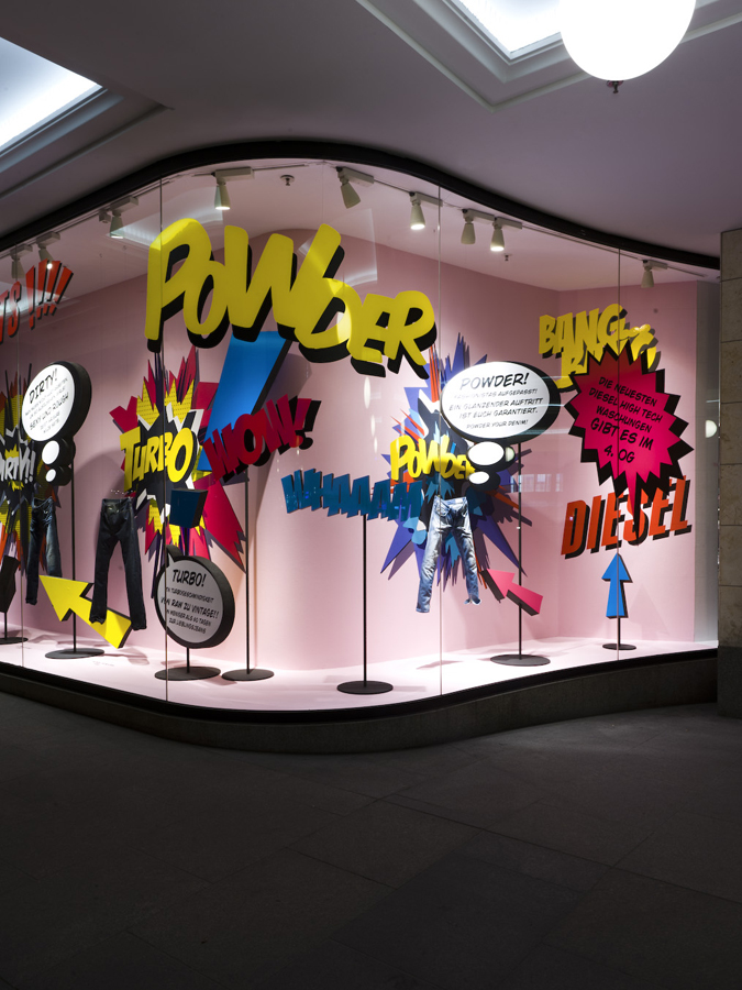 A street installation where for the first time we had to deal with visual merchandising and the challenge of creating a commercial Mise-en scène within the limited space of a street window. Based on elements taken from the cartoon world and having in the back of our minds Roy Lichtenstein’s wonderful illustrations we have created this visual attack (…) with an aware mix between 2d and 3d.