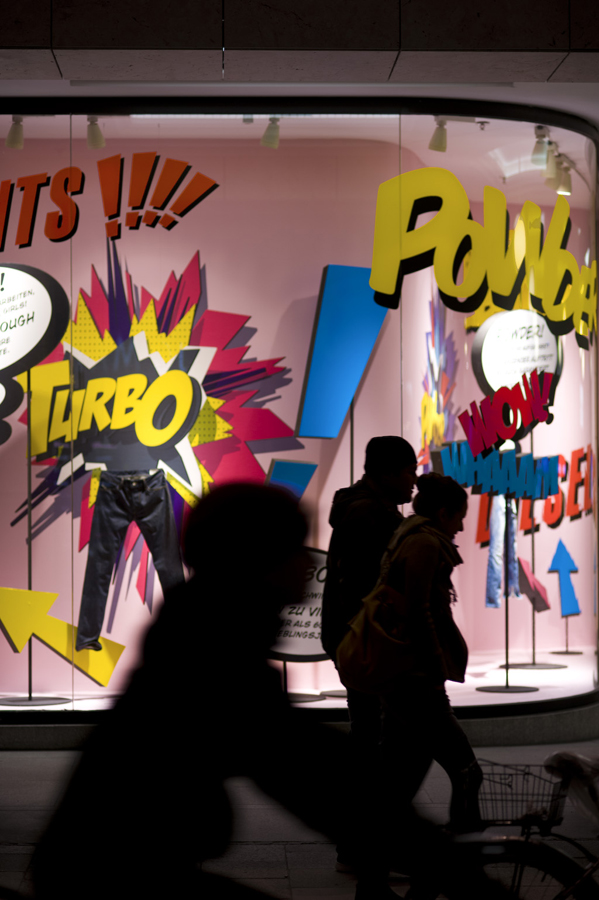 The texts, arrows and other graphic elements make use of all surfaces we had -front window, back wall and the space in between. As all 2d elements had the classic cartoon like flat 3d shadow effect, for the real 3d space we created the just the same using water-jet cut 100mm black foam blocks. The result is a deliberate confusion between all parts… ‘Swallowing’ but then highlighting the thematic jeans in between it all.