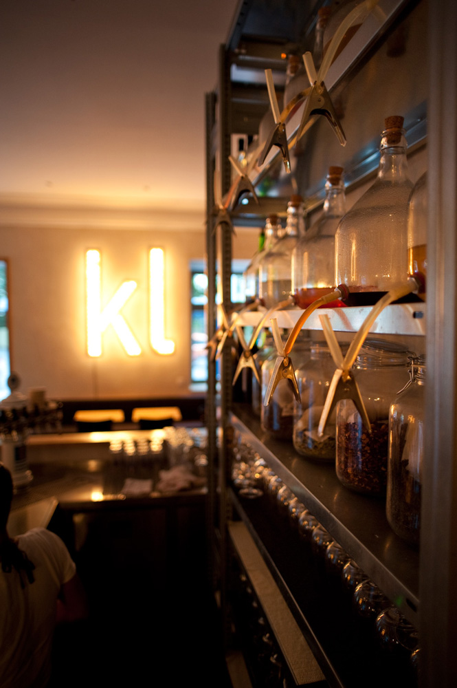 The shelf is an important visual element but at the same time a pragmatic solution to a real lack of space. It is stocked with the restaurants complete wine depot, all the kitchen’s dry supplies and even fresh herbs for a later kitchen use are nourished in it.
