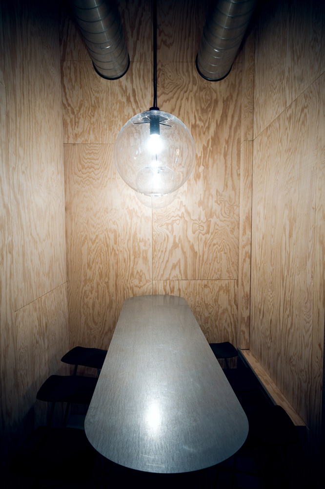 The fine dinning area is more held back in the use of elements. It features shinny black table tops on more refined zink plated table bases together with black and dark green wooden Venus chairs (K.Grcic for Classicon). Mouth blown crystal pendulum lamps stretch the warm and soft glow of the light letter to the fine dinning area, only in a more subtle manner.