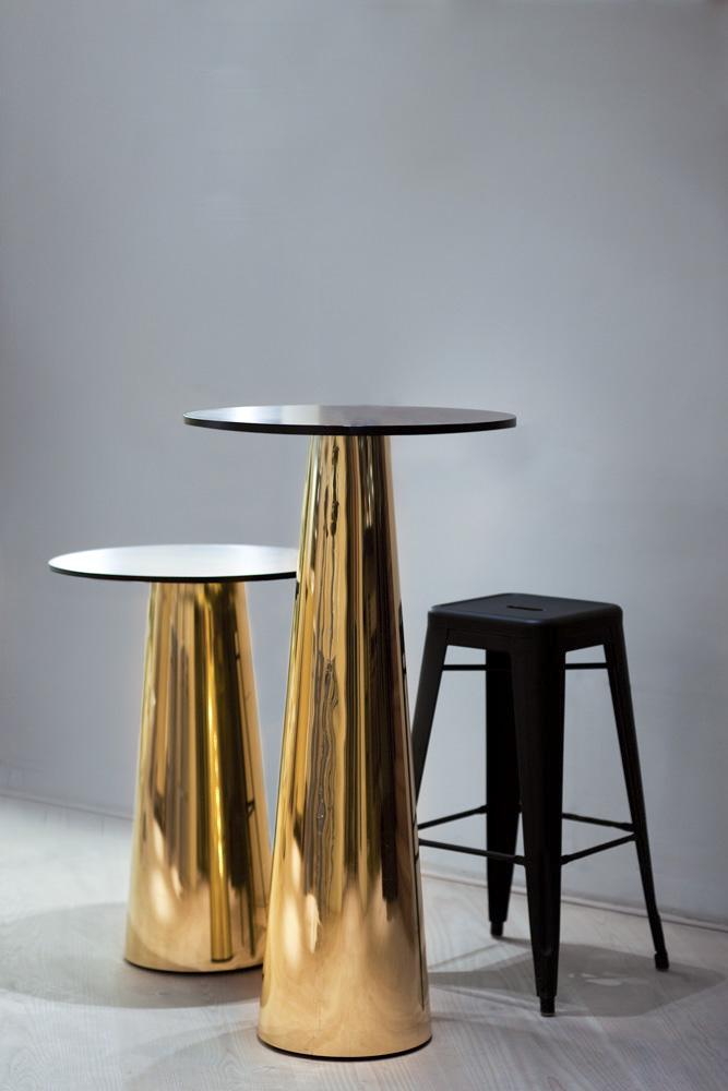 Developing it as a real industrialized product enabled us to easily create variation and turn the cone tables into a variable table system. Throughout the Künstlerhaus there are four variations of the table, two at table height and two at bar height. The top plate is made in glass, black MDF or oak, and the base is made with either polished brass or matte powder coated steel.