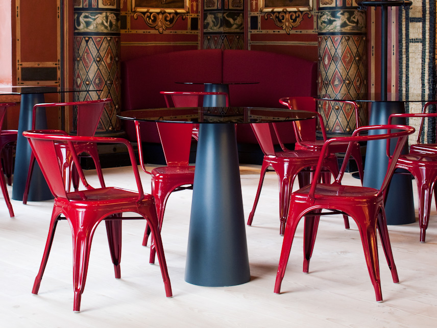 Though simple in form, the cone tables required considerable development and engineering. The final result is an extensive production series (all tables in the Künstlerhaus Farm, Bar and grill are cone tables).