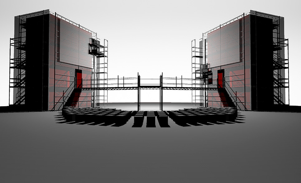 The installation featured two 15m high towers connected by a V-shaped bridge, staging the classical catwalk. The show itself was more of a complete happening. There was movement all around – Models were crossing the bridge from either side, going up and down the towers, using the open elevators and so on…