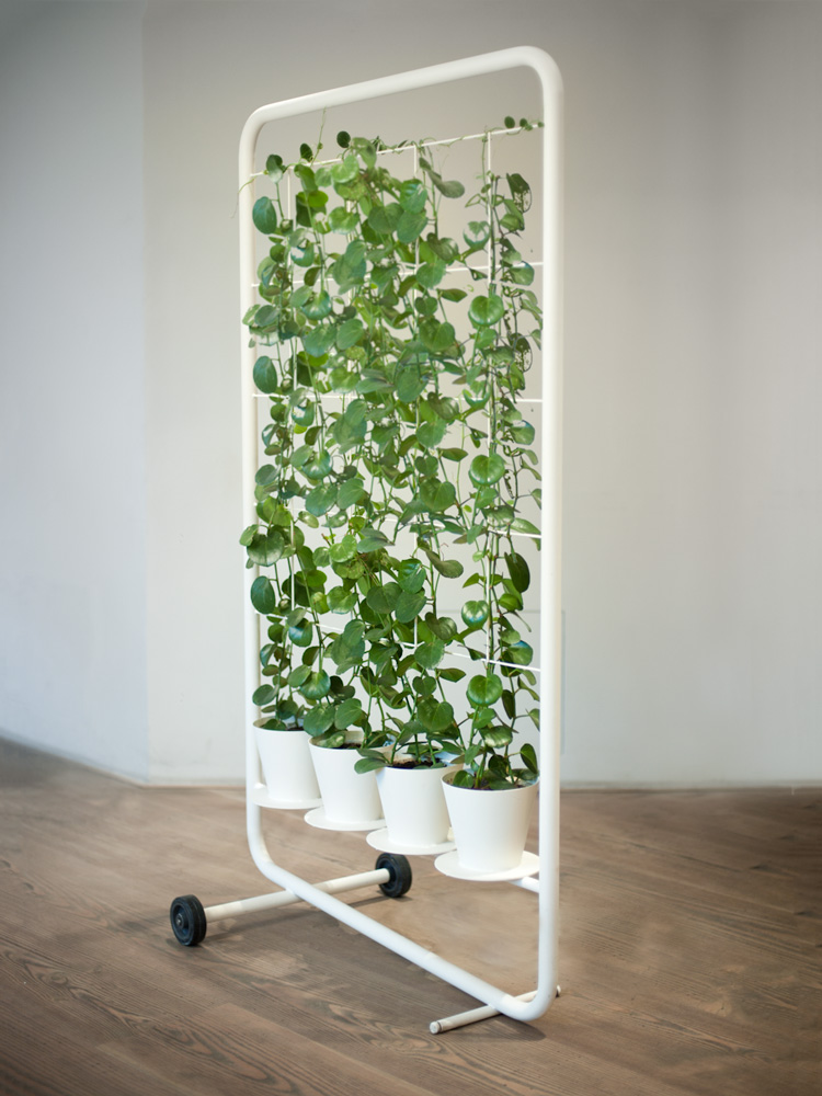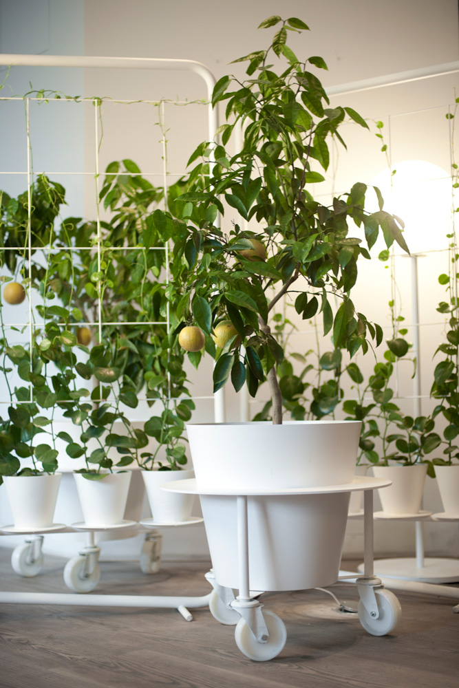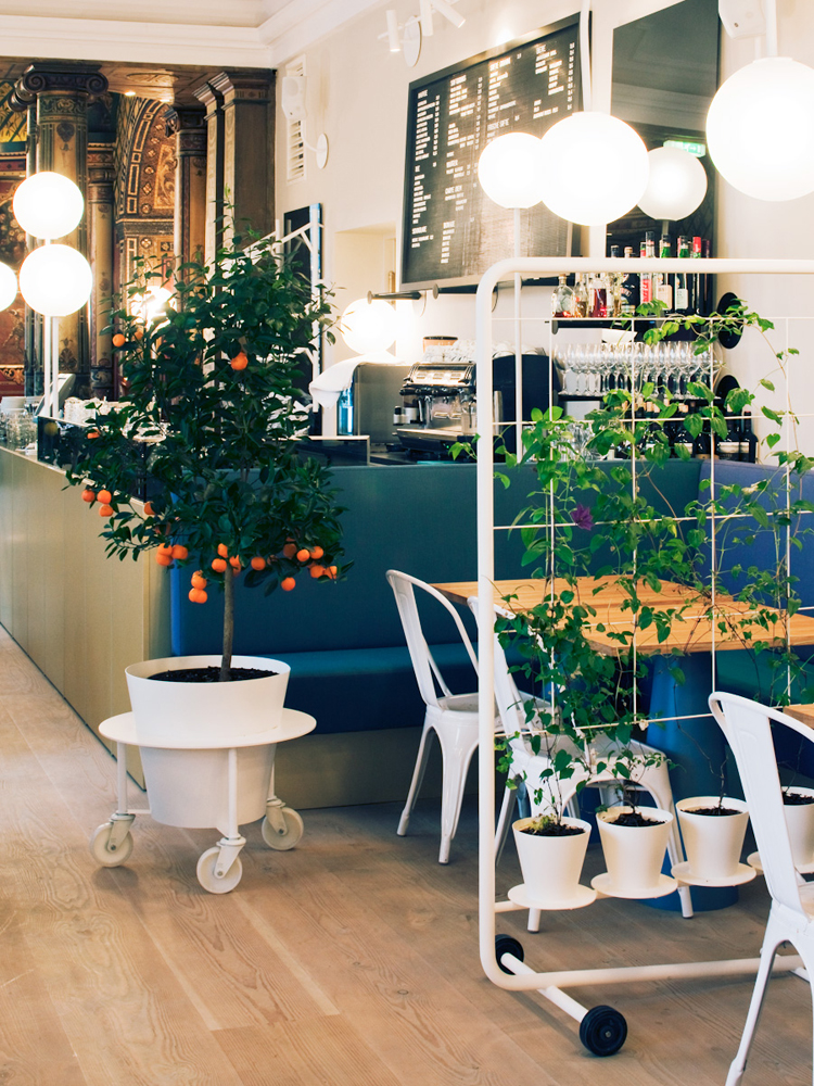 Another offspring of our take on garden elements in the Künstlerhaus-Farm are the rolling planters. Parallel to playing a key role in visually linking the adjacent garden terrace to the Farm’s restaurant interior, the Rolling planters also provide great freedom and constant flexibility in the interior. With no planned specific position, the planters are freely positioned in the space, enabling slight disarray which is typical to a garden and a farm. It contrasts the rigid classic interior with lightness, colour and movement.