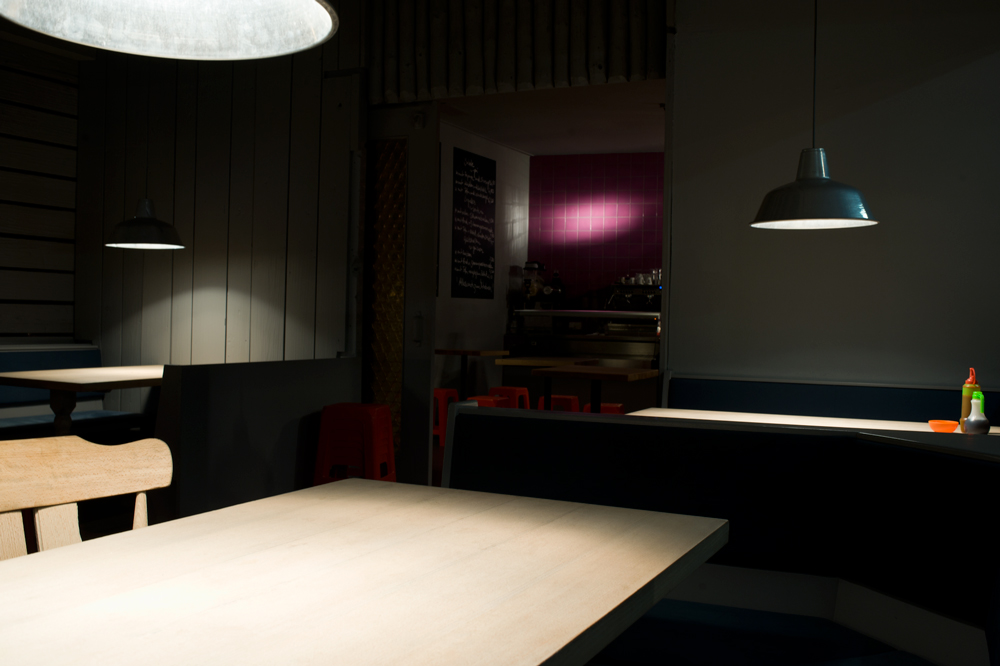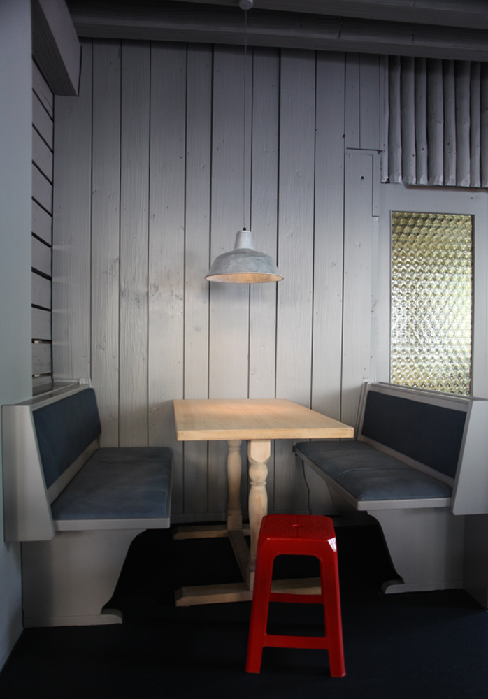 We started with the ‘backdrop’- The typical dark brown wood cladding was washed in light gray. The shabby brown floor was treated with a dark gray industrial coating and the traditional Bavarian furniture got a whole new character after a short sand blasting session. Some strong colours helped us bringing to life the bar and canteen service areas.