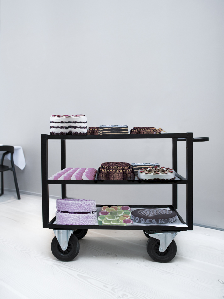 With original load capacity of 125 kilo per shelf custom- izing this extra heavy duty industrial trolley to carry around pastel coloured cream cakes and muffins was >>>