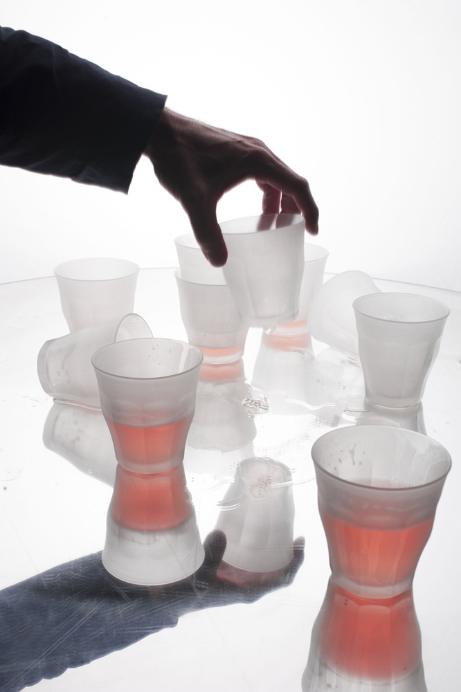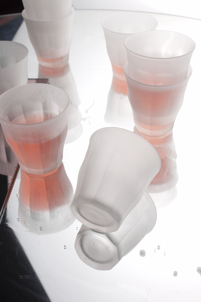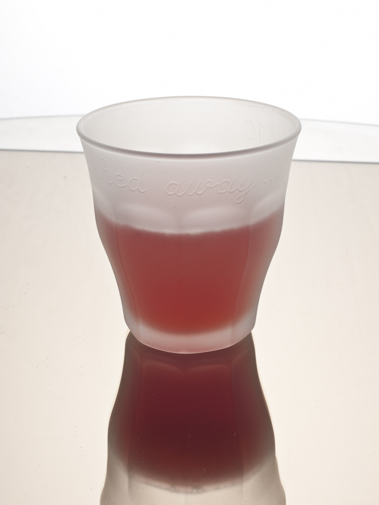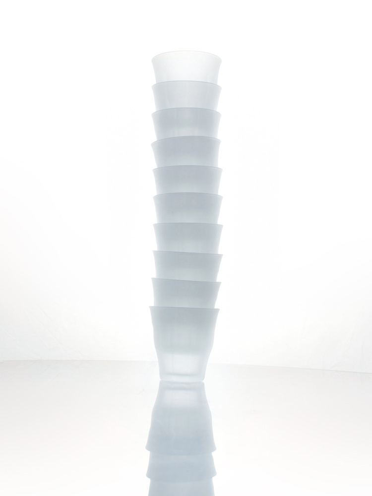 Resembling old glass pieces found washed away by the sea shore -soft, round and carrying fragments of stories… This series of Duralex glasses are washed away by sand. Striped from their natural context and identity they are like a soft ghost of the icon one knows; wearing a new and softer skin -less defined and more precious.
