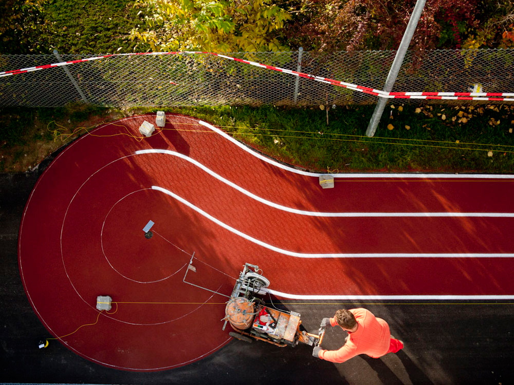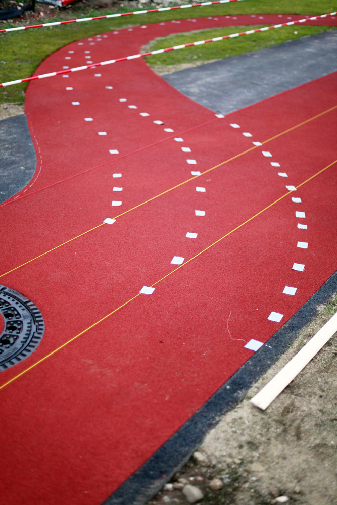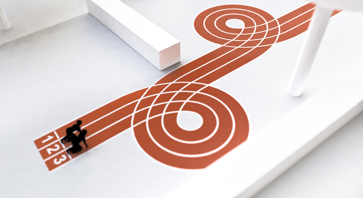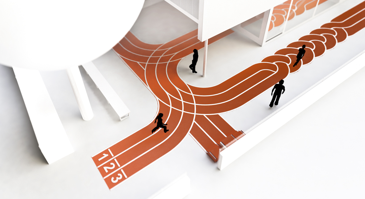 The track engages in a dialogue with its surroundings; conquering a piece of the wall by flowing on it vertically, or deviating and uniting into one lane behind a tree and back to the course… It also integrates the iconic winner’s podium as the visual target to run to.