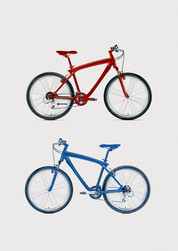 This slightly schizophrenic reality was translated directly to the bicycle. Being a flat, almost two dimensional object, it was perfect to the identity game. Looking at it from top, either half of it were painted in the competitors colours.